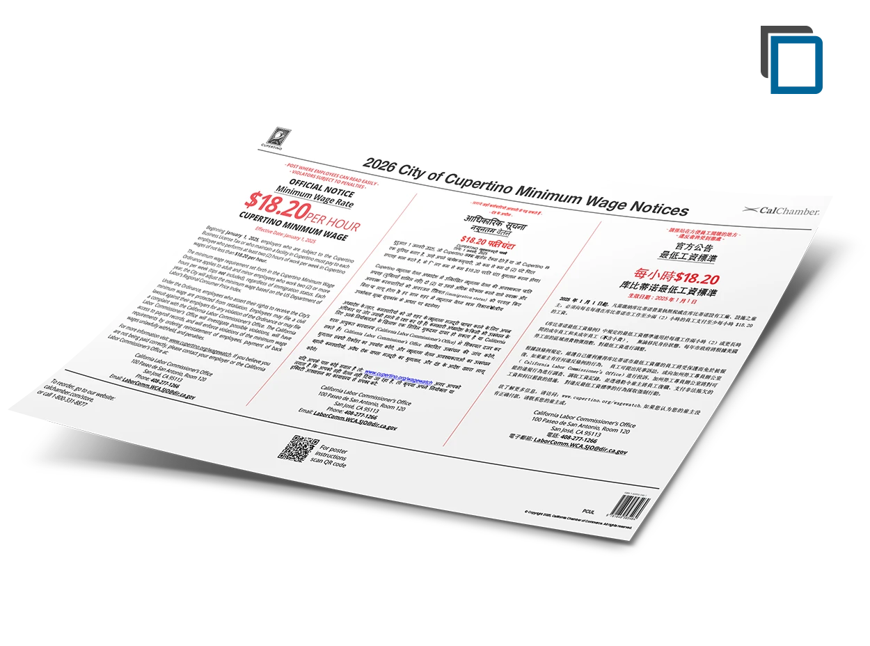 CalChamber’s 24” x 14” Cupertino Minimum Wage poster (English, Chinese, Hindi combined) contains the official notice with the current minimum wage as required by the City of Cupertino.