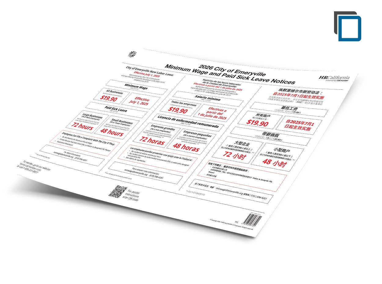 The Emeryville Labor Law Poster (24.5” x 16”) in English/Spanish/Chinese combined contains the official employment notices required by City of Emeryville’s Minimum Wage and Paid Sick Leave Ordinances. These notice obligations apply to all employers with employees, including part-time and temporary employees, who perform at least two hours of work in one calendar week in Emeryville. The poster must be posted in all languages spoken by 10 percent or more of your employees at a location.