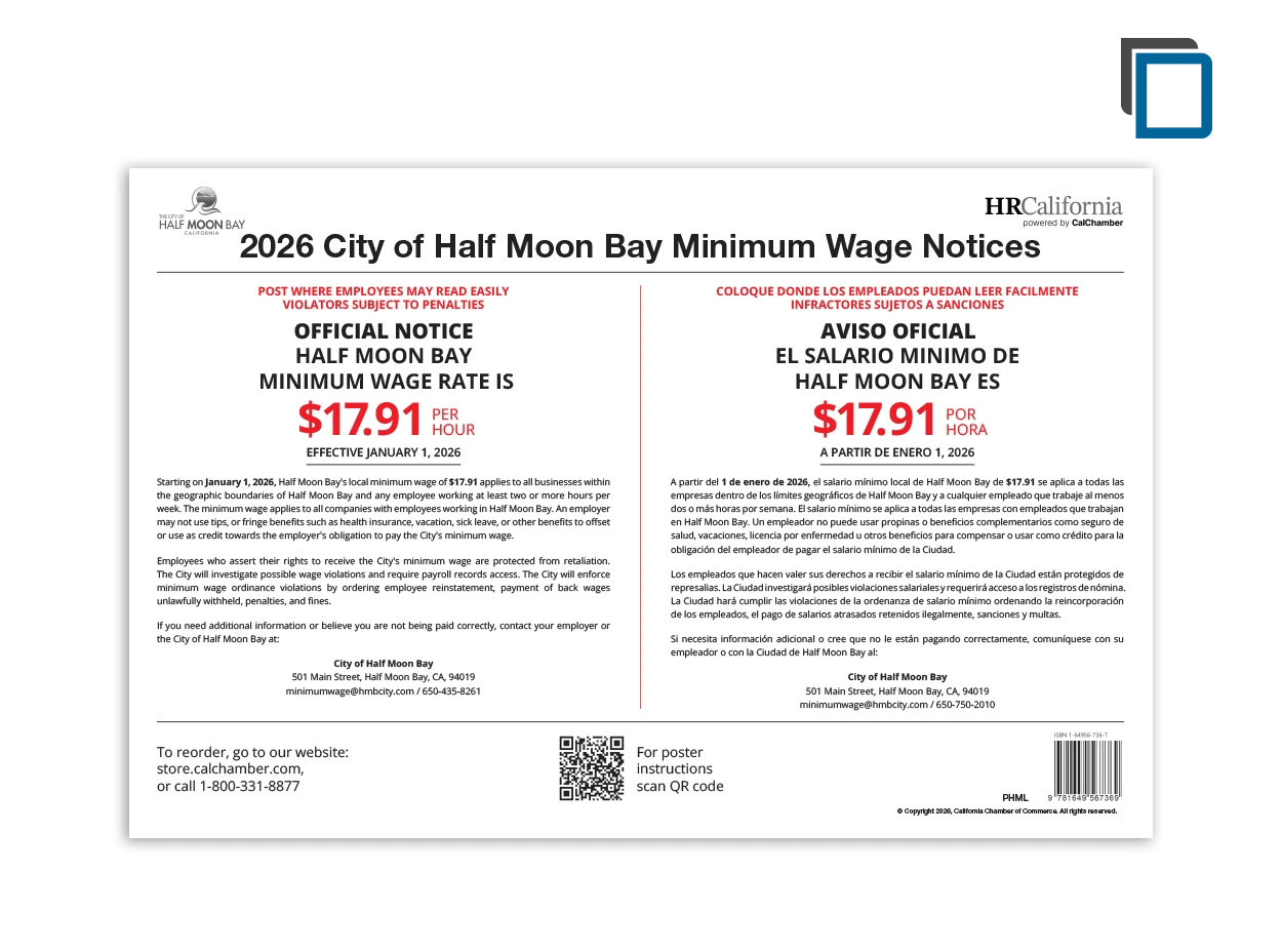 CalChamber’s 17" x 11" Half Moon Bay Minimum Wage poster (English and Spanish combined) contains the official Half Moon Bay Minimum Wage notice.