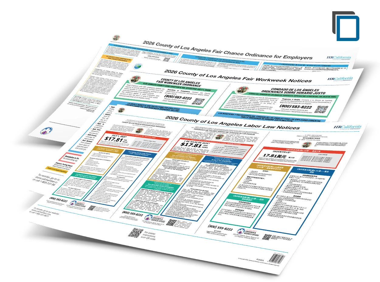 If you've previously purchased a County of Los Angeles Labor Law Poster dated prior to July 2025 from CalChamber, you’ll need to purchase a current County of Los Angeles Labor Law Notices Poster (Item PLACOL).