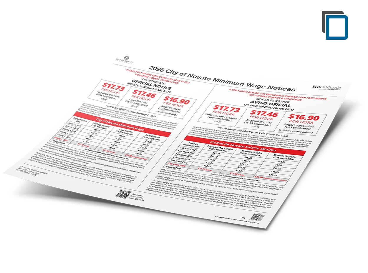 CalChamber’s 24" x 19" Novato Minimum Wage poster (English and Spanish combined) contains the official City of Novato Minimum Wage notice.
