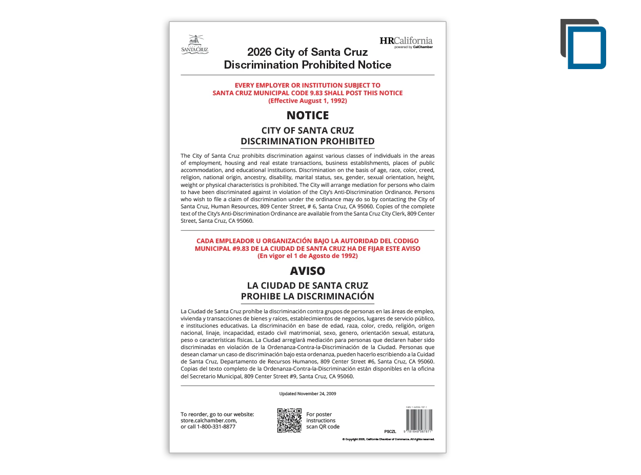 CalChamber’s 11” x 17” Santa Cruz Anti-Discrimination poster (English and Spanish combined) contains the official notice as required by the City of Santa Cruz Anti-Discrimination Ordinance.