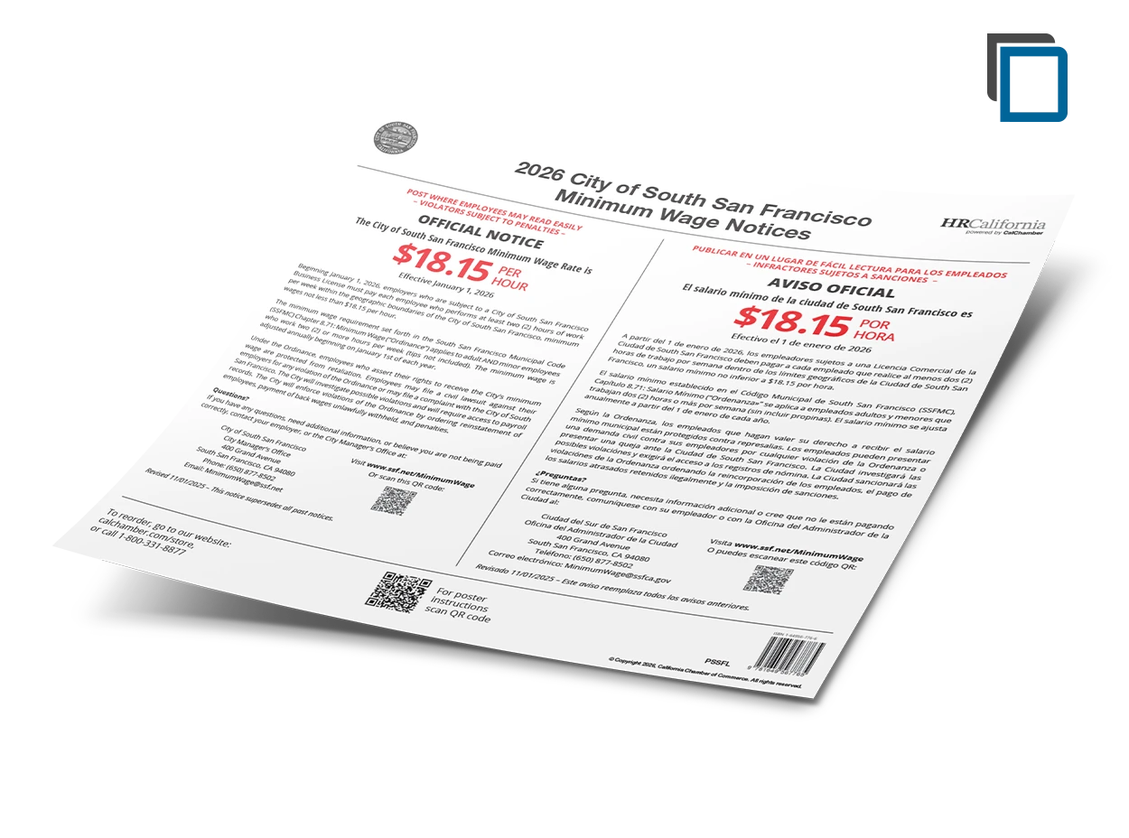 Compliance Alert: CalChamber's poster reflects South San Francisco’s minimum wage of $18.15/hour effective January 1, 2026. Employers must post the most current notices.