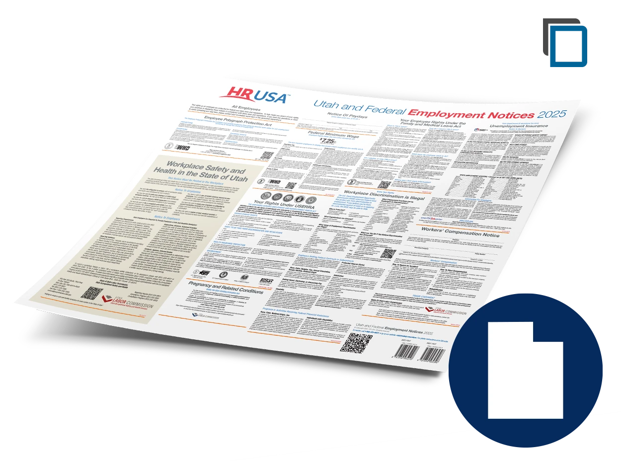 HRUSA's convenient 27.5" x 22.25" all-in-one poster contains easy to read state and federal employment notices every Utah employer must post — even if you only employ one person in Utah. Make sure you're in compliance.