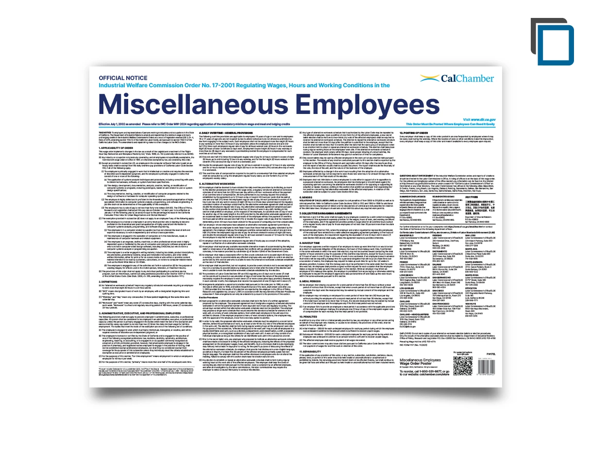 Wage Order 17 regulates wages, hours and working conditions for Miscellaneous Employees.