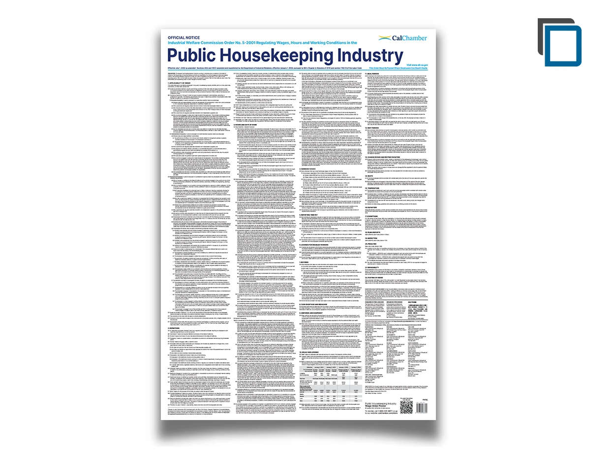 CalChamber’s laminated 27.5” x 39.75” English poster and 27.5” x 39.75” Spanish poster each combines the multiple pages of Wage Order 5 into one convenient poster. These posters are recyclable.