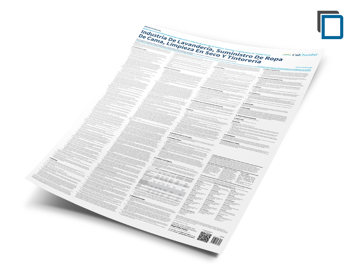 CalChamber’s laminated 27.5” x 37” English poster and 27.5” x 35.5” Spanish poster each combines the multiple pages of Wage Order 6 into one convenient poster. These posters are recyclable.